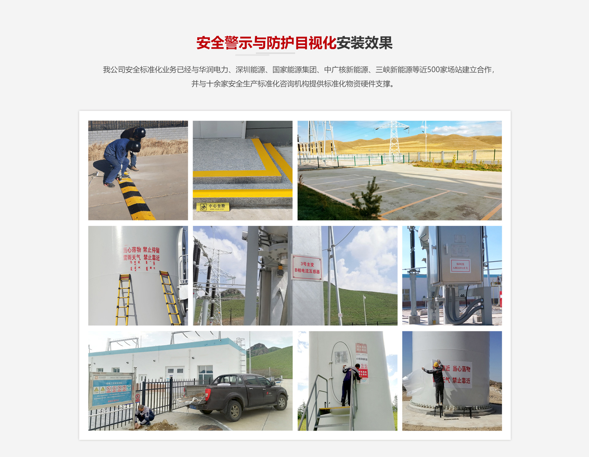我公司安全標(biāo)準(zhǔn)化業(yè)務(wù)已經(jīng)與國家能源集團(tuán)、中廣核新能源、三峽新能源等近500家場(chǎng)站建立合作,并與十余家安全生產(chǎn)標(biāo)準(zhǔn)化咨詢機(jī)構(gòu)提供標(biāo)準(zhǔn)化物資硬件支撐。