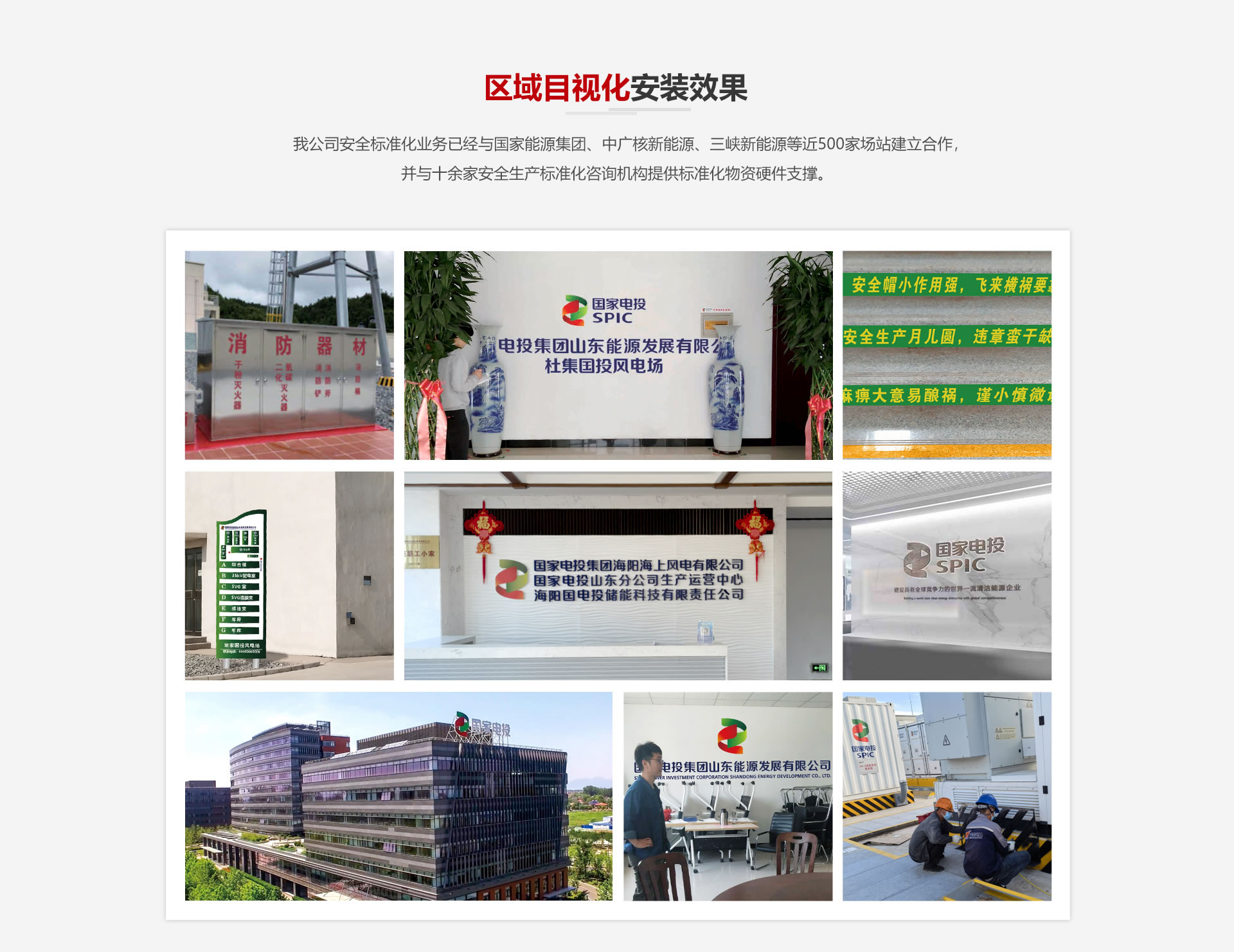 我公司安全標(biāo)準(zhǔn)化業(yè)務(wù)已經(jīng)與國(guó)家能源集團(tuán)、中廣核新能源、三峽新能源等近500家場(chǎng)站建立合作,并與十余家安全生產(chǎn)標(biāo)準(zhǔn)化咨詢(xún)機(jī)構(gòu)提供標(biāo)準(zhǔn)化物資硬件支撐。