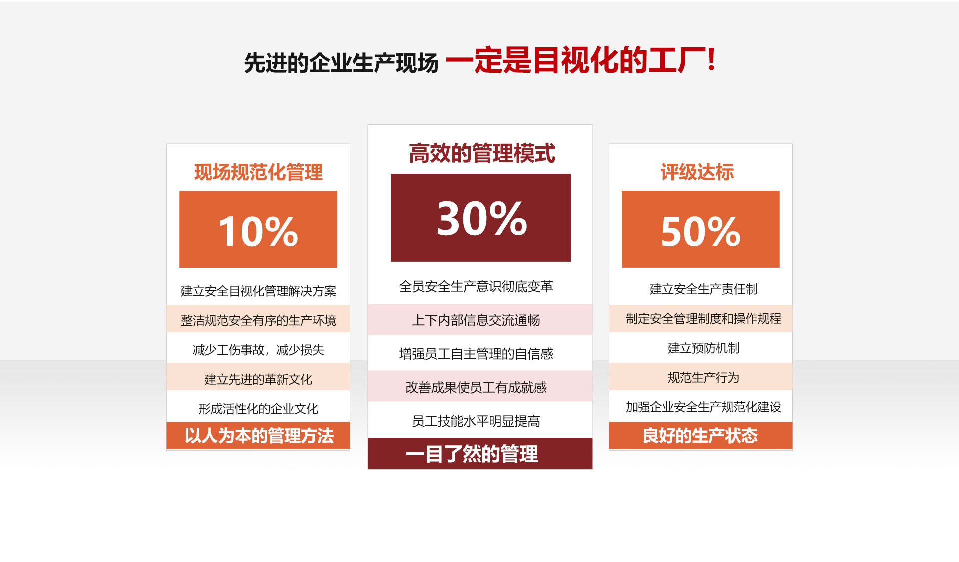 華泰安全目視化管理以安全法律、法規(guī)、標(biāo)準(zhǔn)和危害識別風(fēng)險評價為基礎(chǔ),運用標(biāo)識警示、6S管理、看板管理、定置管理等方法,結(jié)合企業(yè)VI、生產(chǎn)的特點、安全管理現(xiàn)狀,將各方內(nèi)容融合,策劃一套系統(tǒng)的安全目視化管理解決方案。