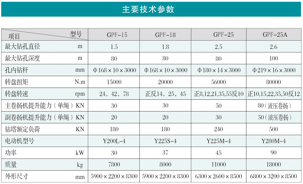 GPF型系列工程鉆機是一種可滿足正、反循環鉆進工藝要求的大口徑轉盤式鉆孔設備。主要用于橋粱、港口、高層建筑、水壩等基礎工程大口徑灌注樁施,還可鉆鑿水井及其它工程孔。